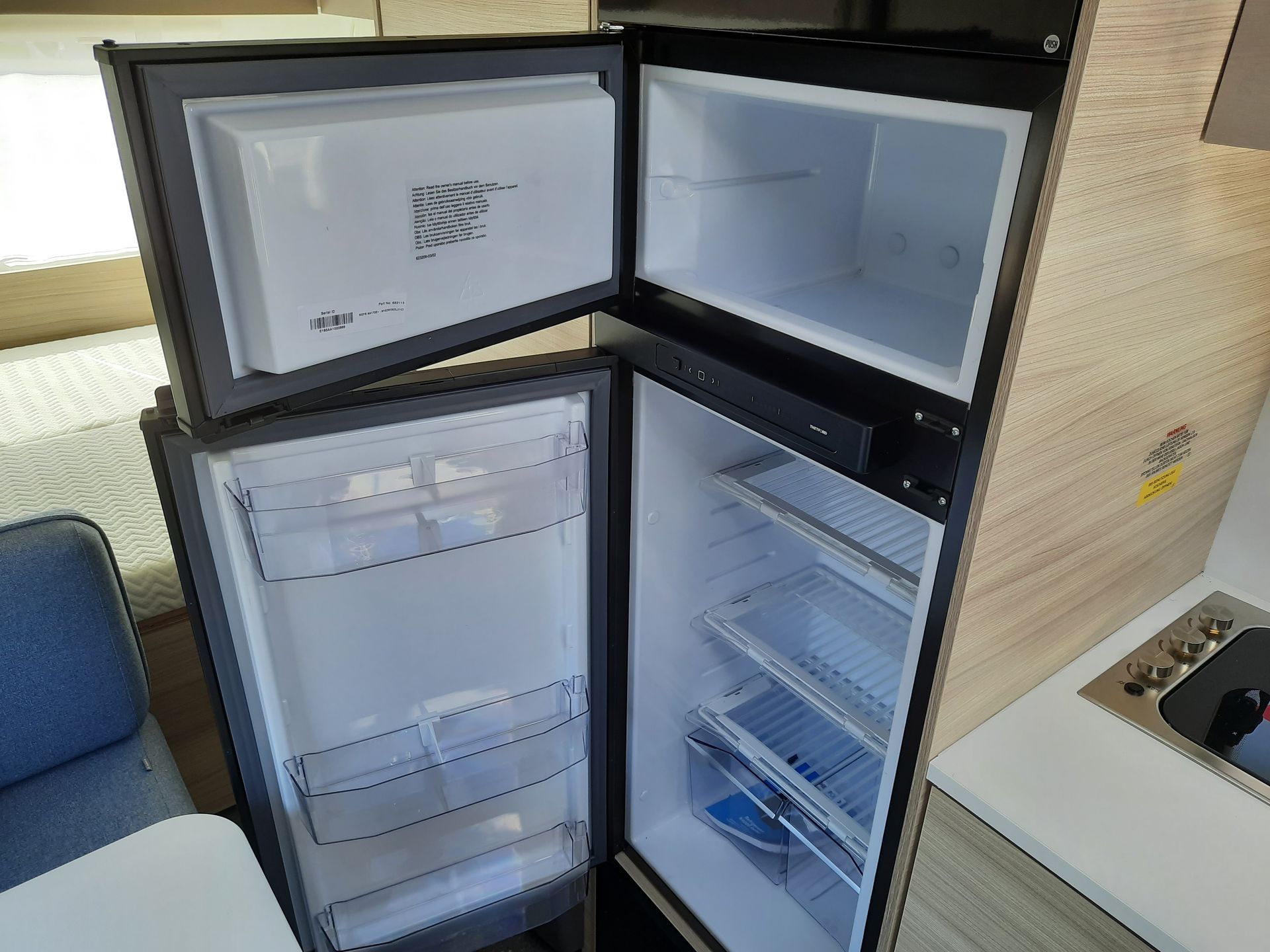Neben den Sitzgruppe befindet sich die Küche mit 165L Kühlschrank und einer Mikrowelle darüber.