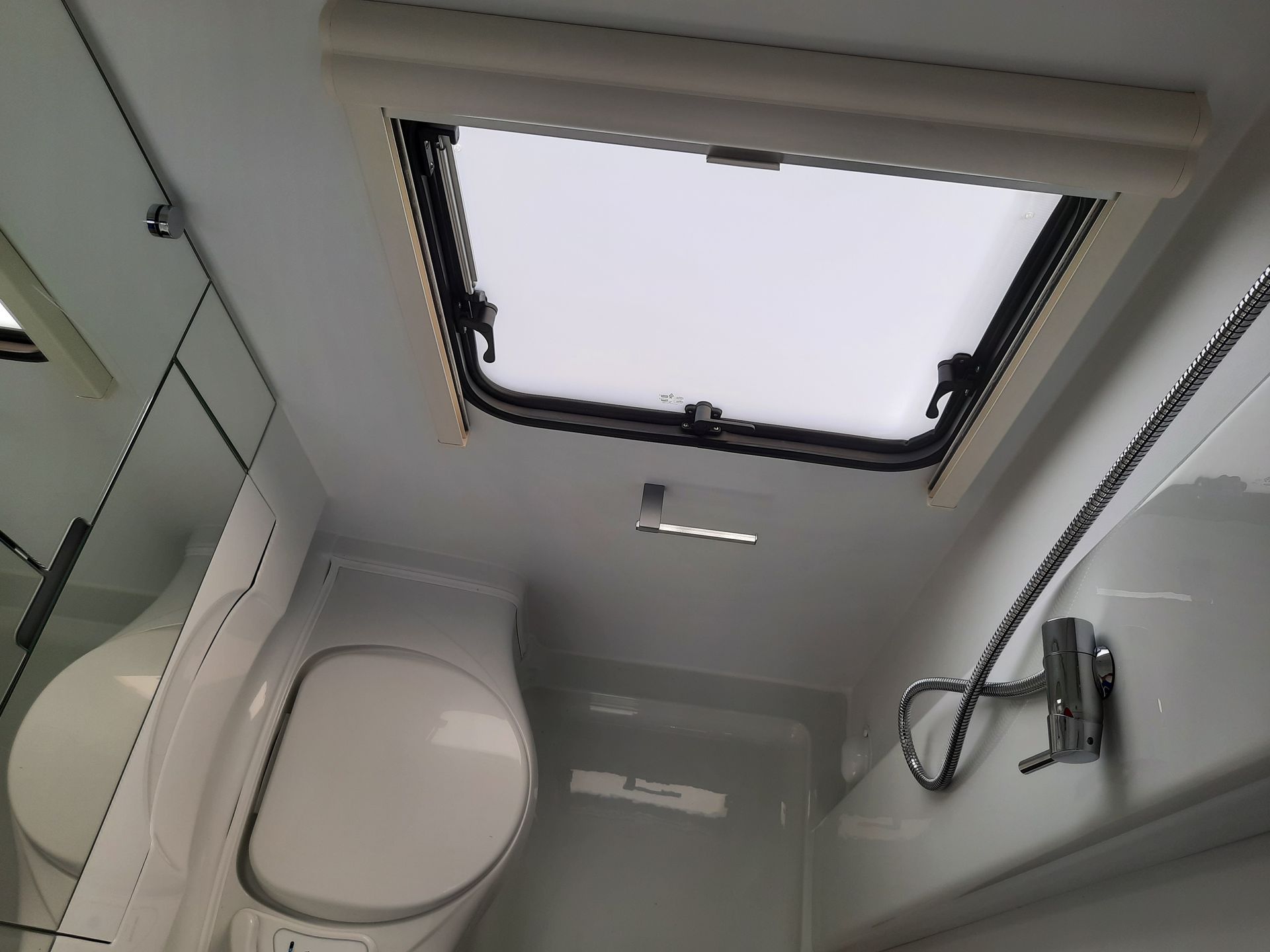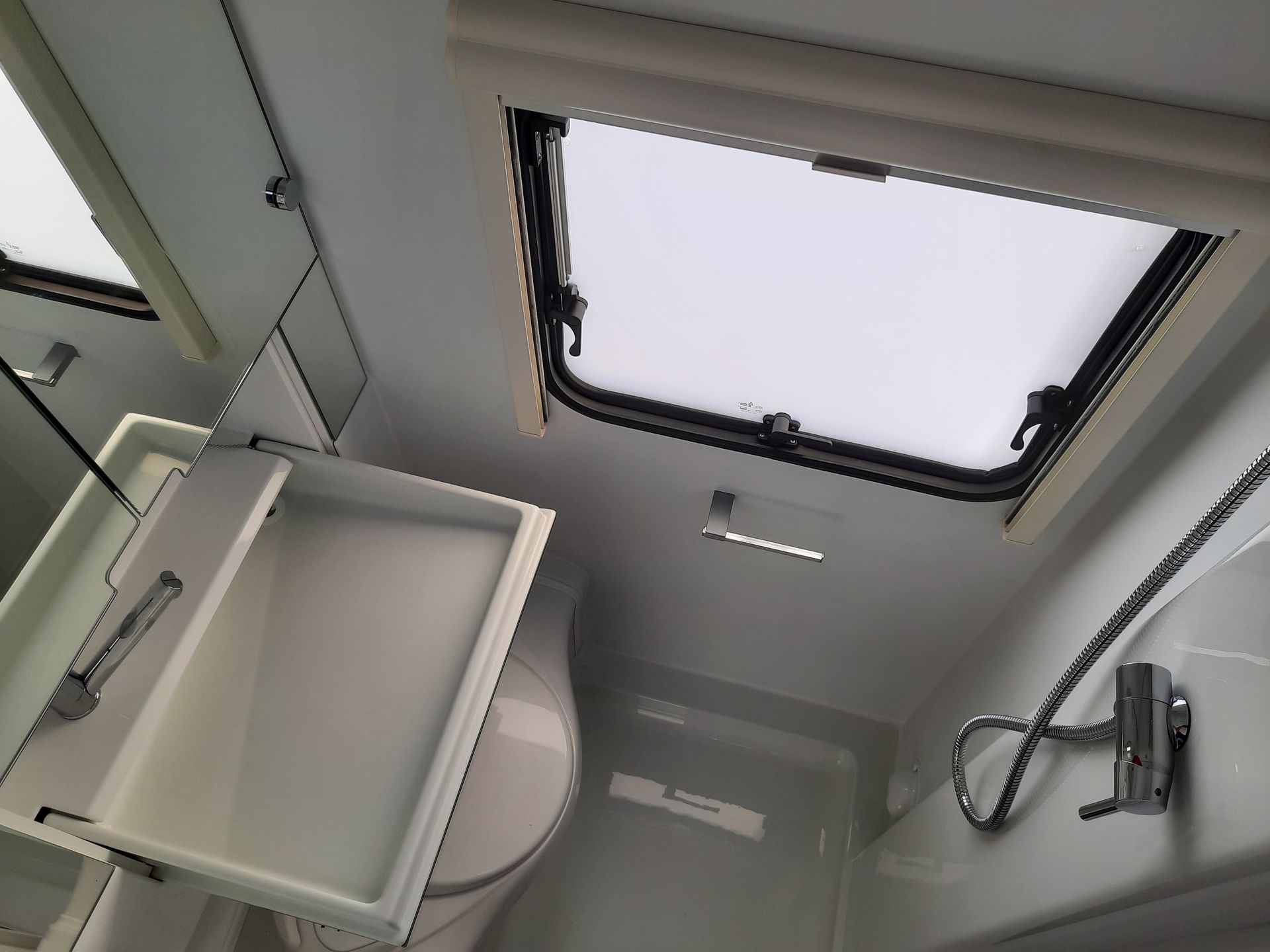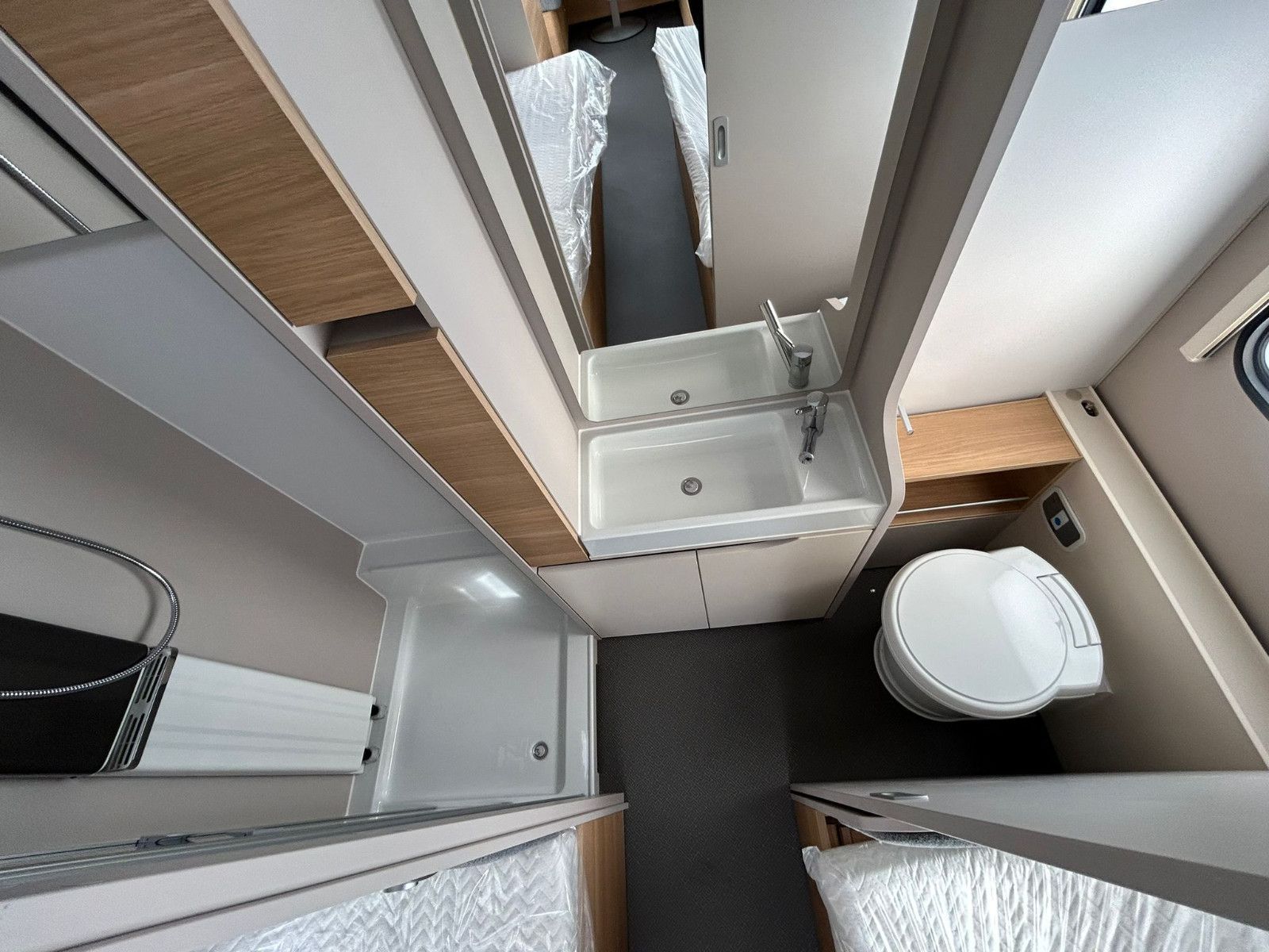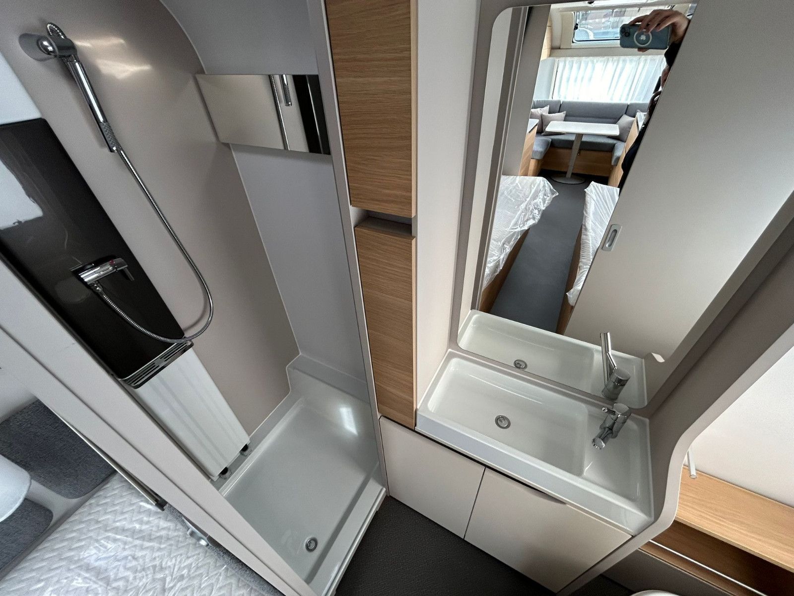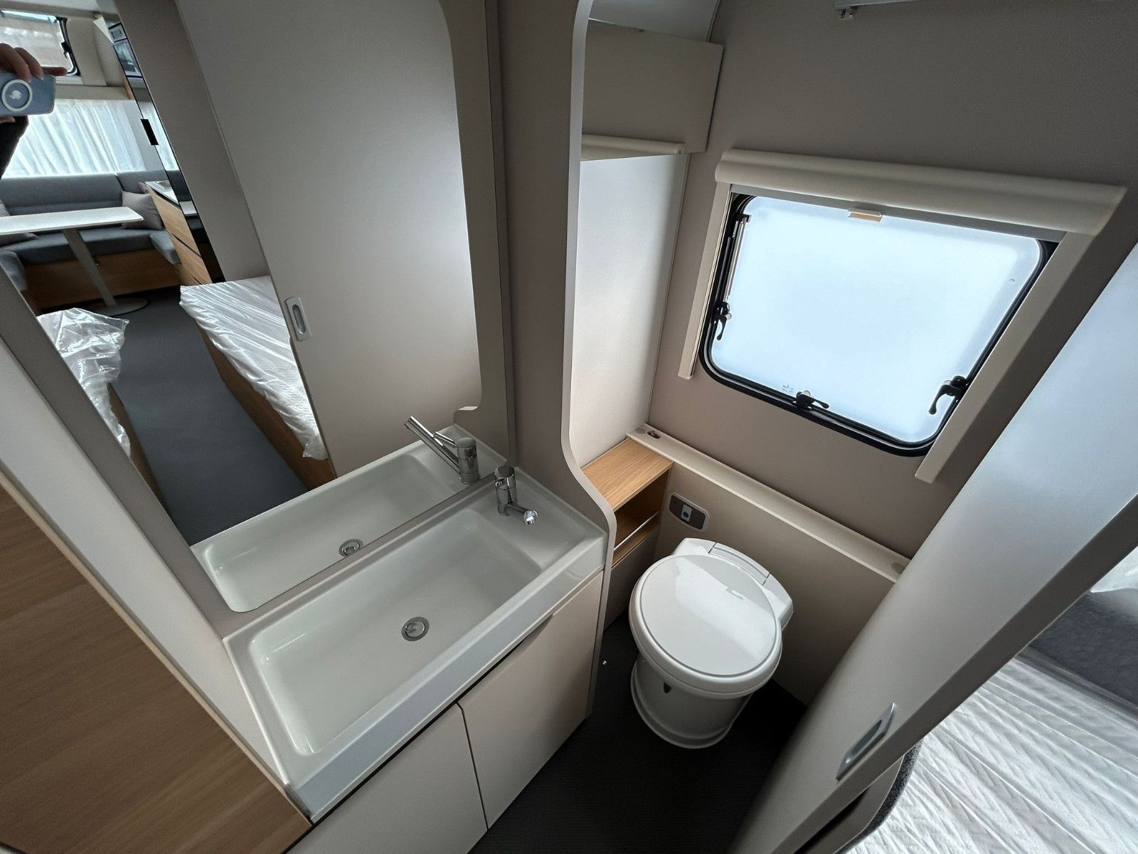 Der Wohnwagen bietet viel Komfort, speziell das Heckbad