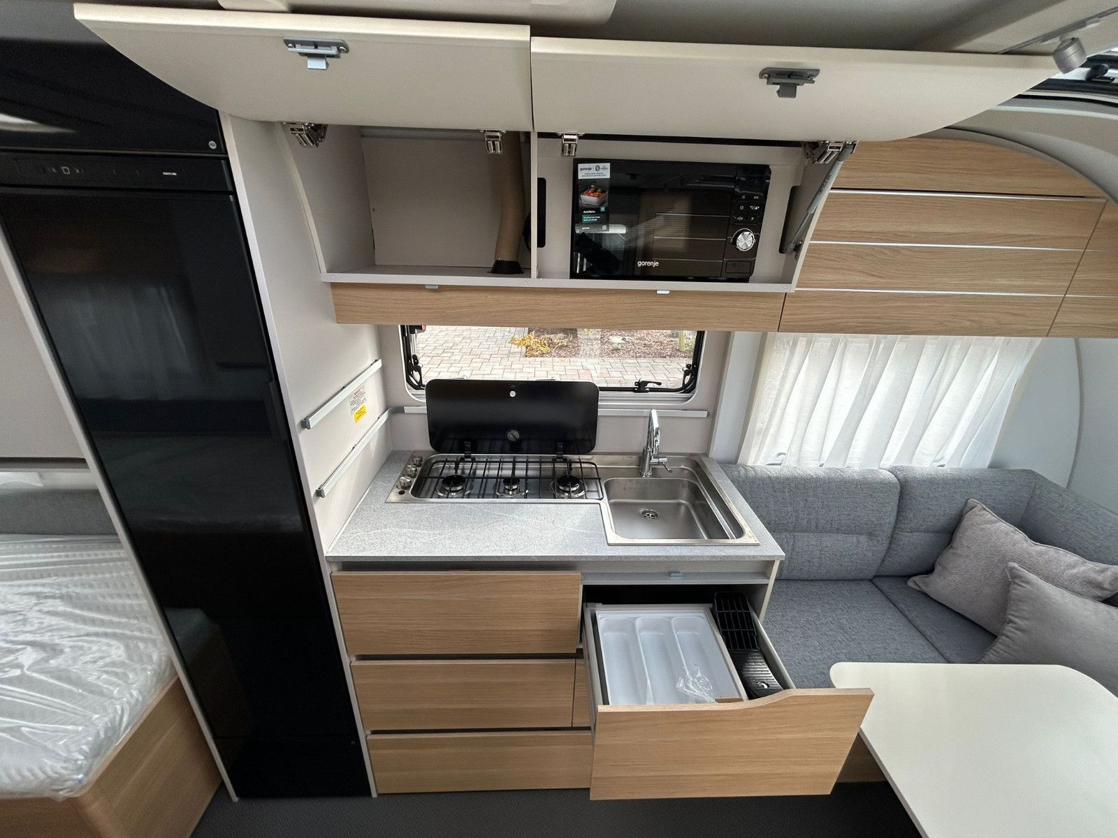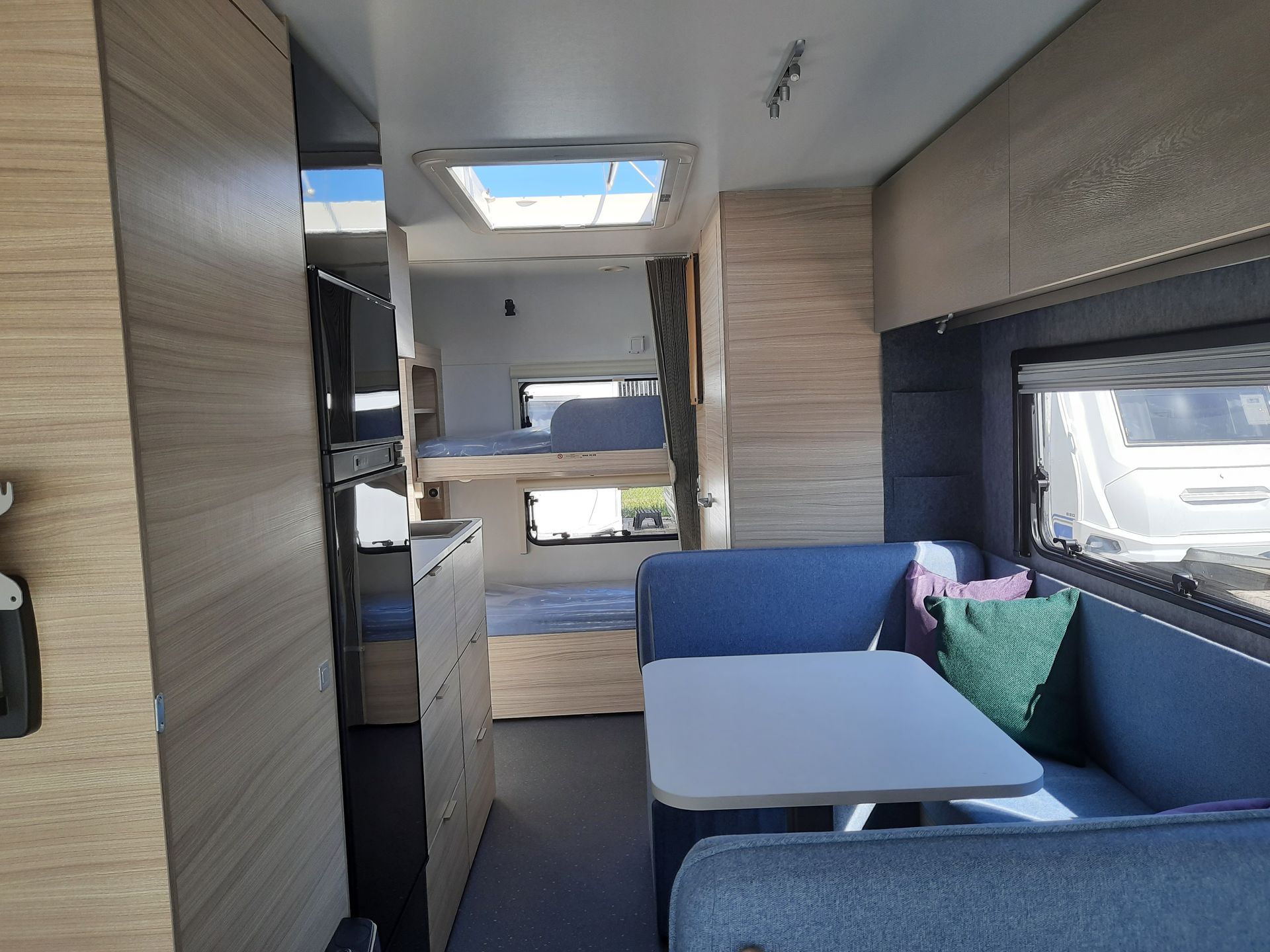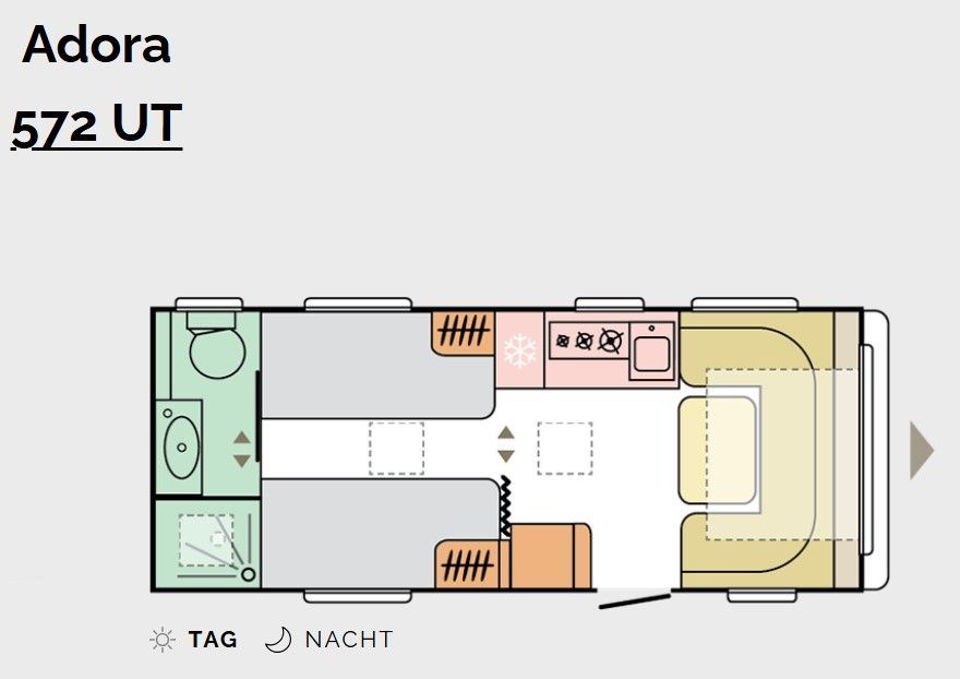Der Adora 542UL Wohnwagen bietet geräumigen Platz und viel Stauraum auf kleiner Fläche. Der 542UL hat zwei Einzelbetten und ein Seitenbad.