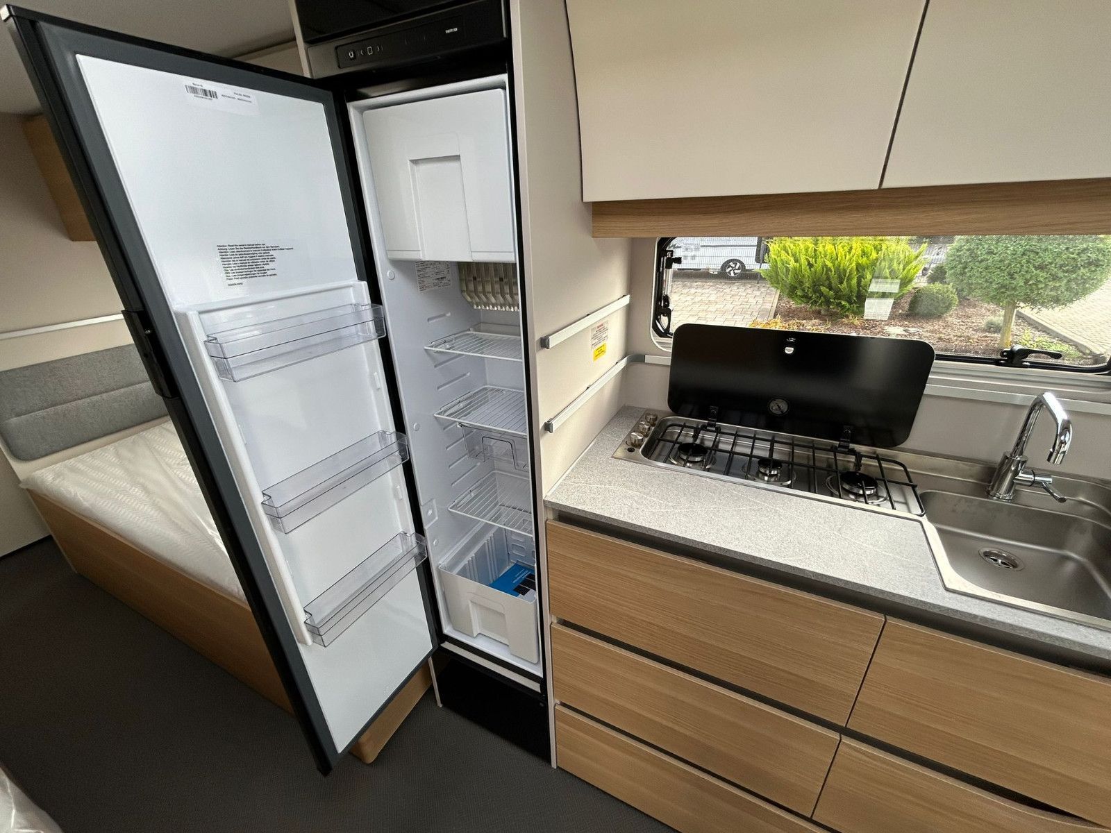 - Küche mit 165L Kühlschrank mit separatem Gefrierfach und 3-Flammenherd