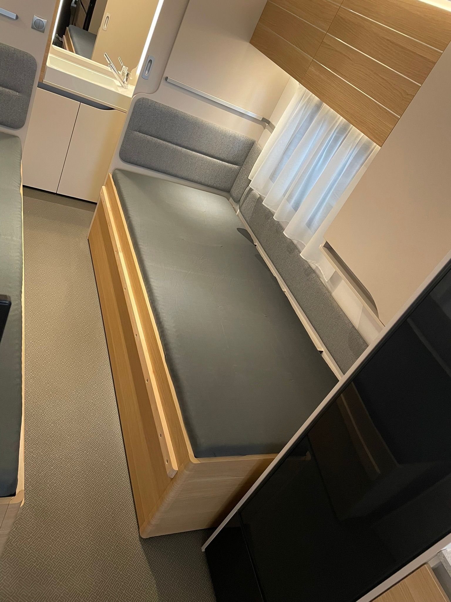 - Eine gemütliche Sitzgruppe mit Tisch, die sich bei Bedarf in ein weiteres Bett mit den Maßen 210x125cm umwandeln lässt